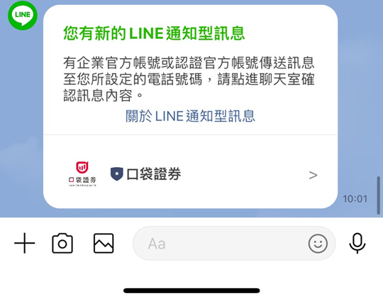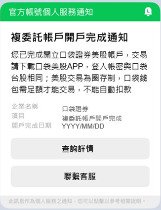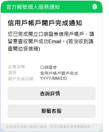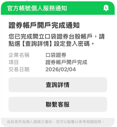 A:會,口袋證券會在開戶完成後寄出 LINE 訊息相關通知,如下附圖。